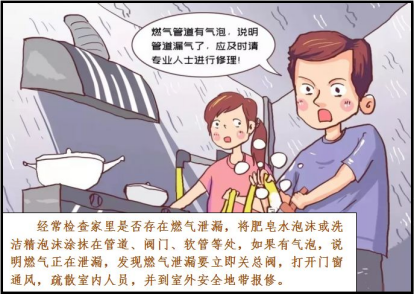 (1)异味明显,断气通风。嗅到室内有天然气气味(臭鸡蛋味)或发现天然气有泄漏时,应立即关闭气表前总阀,打开门窗通风。操作时动作应轻缓,以免产生静电火花、撞击火花等点火源引起天然气爆炸。