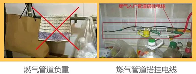 《山东省燃气管理条例》第二十八条规定:燃气用户应当配合燃气经营企业入户进行燃气安全检查,遵守安全用气规则,并不得实施下列行为:(二)用燃气管道作为负重支架或者接地引线。违反规定,用户应当立即整改。