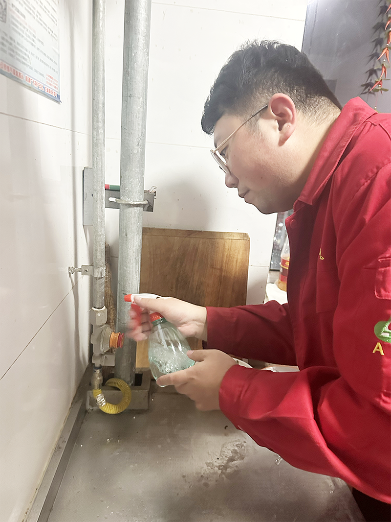 3.日常可用肥皂水或洗洁精水喷涂在燃气管道的接头、阀门及燃气开关等连接处进行自检自查,若有冒泡,则说明有漏气。