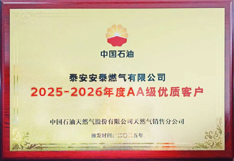 近日,泰安安泰燃气有限公司被中国石油天然气股份有限公司天然气销售分公司授予“2025—2026年度AA级优质客户”荣誉称号。该荣誉是中国石油对合作企业的高度认可,更是对公司长期以来深耕能源保障、恪守契约精神、积极履行社会责任的权威肯定。