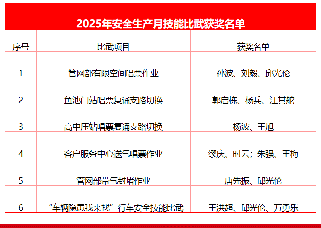 公司围绕行车安全与燃气生产运营,开展多样化比武活动。生产运营方面,管网部、鱼池门站、高中压站及客户服务中心分别开展了阀门井有限空间作业、支路切换、送气安全操作唱票、封堵作业等比武活动,以实战化强化“唱票复诵”机制,切实提升一线人员规范操作水平。后勤保障方面,通过举办“车辆隐患我来找”行车安全技能比武,将安全规范融入操作细节,让应急能力在竞技中淬炼升华。